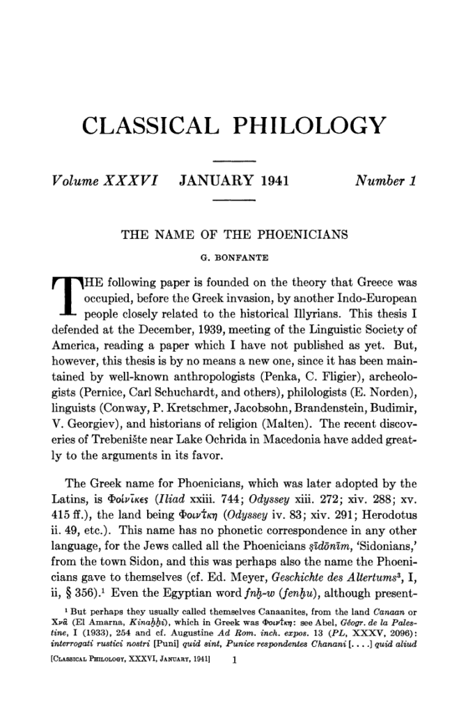 - Bonfante, G. (1941). “The Name of the Phoenicians”, Classical Philology, Vol. 36, No. 1. The University of Chicago Press.