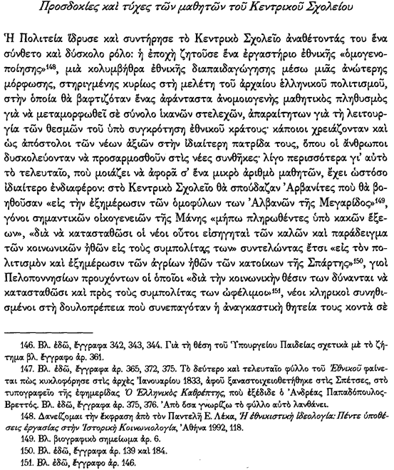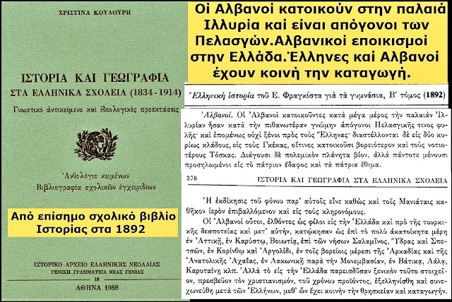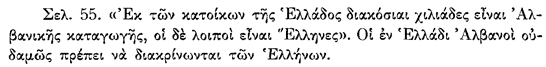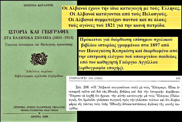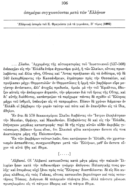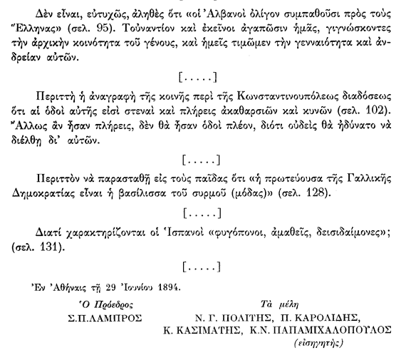 Në tekstin e vitit 1864, thuhet shprehimisht: “Shqiptarët janë pasardhës të drejtpërdrejtë të Pellazgëve… ata janë Grekë dhe kanë qenë gjithmonë bashkë me ne në mbrojtje të lirisë”. Ky interpretim shërbente për të neutralizuar çdo konflikt të mundshëm etnik brenda kufijve të shtetit të ri grek, duke e paraqitur praninë e shqiptarofonëve si një element organik të helenizmit.