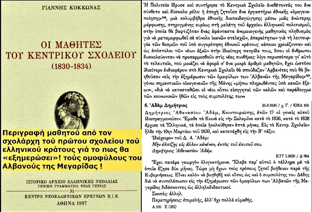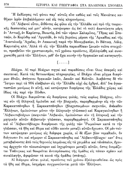 Në dokumentin që analizon “natyrën” e popujve ballkanikë, theksohet se përcaktimi i “neve” (grekëve) bëhet shpesh në kontrast me “tjetrin”. Megjithatë, për shqiptarët thuhet se: “Konsiderohen si racë që i përket kombit grek, për sa kohë që e kanë prejardhjen nga ilirët e lashtë”. Kjo narrativë ndihmoi në integrimin e popullatave shqiptarofone (arvanitasve) pa krijuar trauma identitare në procesin e arsimimit shtetëror.
