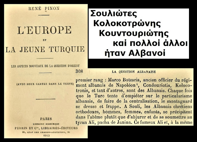 Pinon, R. (1913). L’Europe et la Jeune Turquie: Les aspects nouveaux de la question d’Orient. Paris: Librairie Académique Perrin et Cie. (Dëshmi mbi origjinën shqiptare të krerëve të revolucionit si Boçari, Kondurioti dhe Kolokotroni).