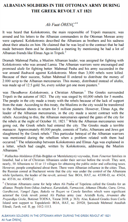 Örenç, A. F. Albanian Soldiers in the Ottoman Army During the Greek Revolt at 1821. (Studim mbi praninë e forcave shqiptare në ushtrinë osmane dhe raportet e tyre me kryengritësit helenë me origjinë shqiptare).