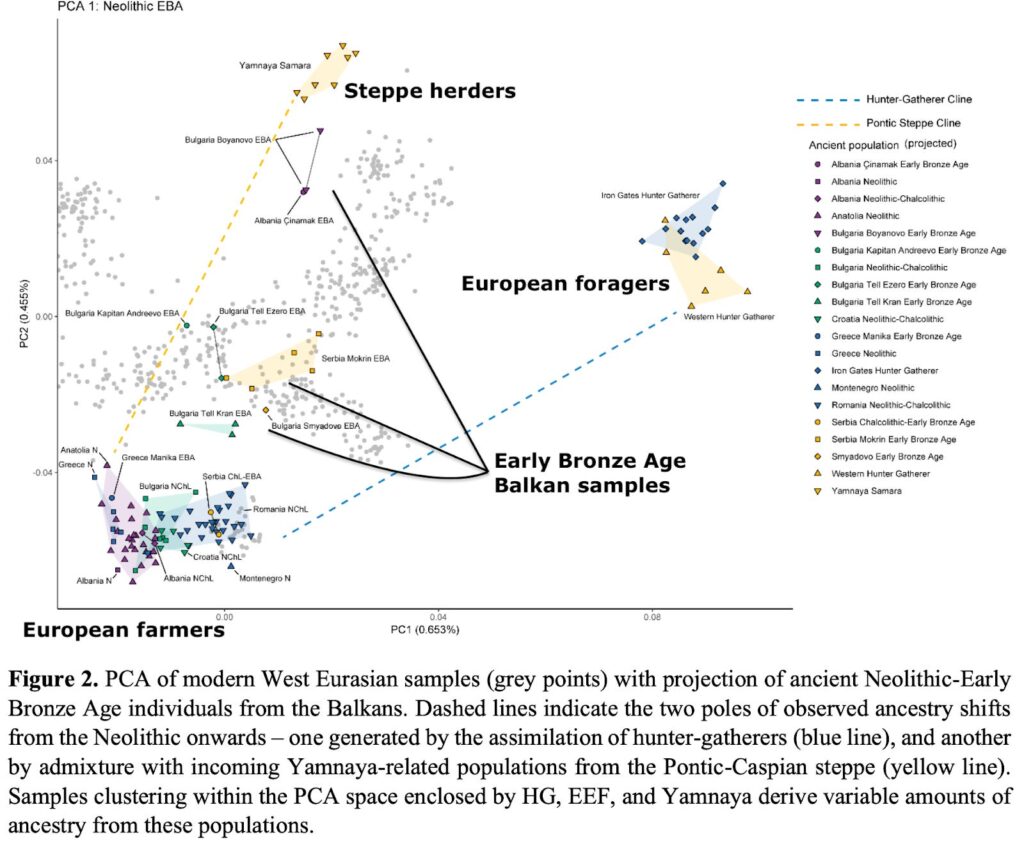 Analizat tregojnë se rreth vitit 2500 p.e.s., në Ballkanin Perëndimor mbërritën barinj nga stepa pontike, të lidhur drejtpërdrejt me kulturën Yamnaya. Para kësaj periudhe, rajoni banohej nga bujq me prejardhje nga fermerët anatolianë, të cilët kishin nisur zgjerimin drejt Ballkanit rreth 9,000 vjet më parë.