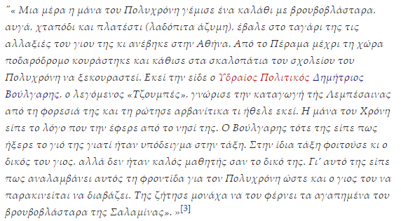 Një moment kyç që dëshmon lidhjen e tij organike me botën arbërore është takimi i nënës së tij me politikanin e fuqishëm hidriot, Dhimitër Vullgarin (i njohur si “Xhumbé”). Materialet arkivore përshkruajnë një skenë gati kinematografike: e ëma e Polikronit, e veshur me kostumin tradicional arbëror dhe e ngarkuar me shporta me prodhime të ishullit (vezë, oktapodë dhe platesti – byrek i pjekur), ulet në shkallët e shkollës për të pushuar. Vullgari, duke e njohur prejardhjen e saj nga veshja, i drejtohet në shqip: “Çfarë kërkon këtu?”