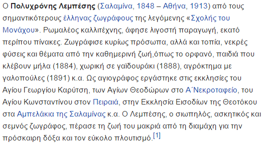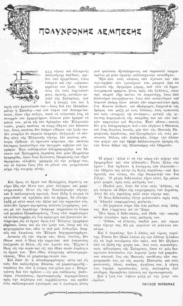 Nirvana, P. (1913). “Polychronis Lembesis”. Botuar në revistën mujore filologjike dhe artistike “Pinakothiki” (Πινακοθήκη), Viti IG’, prill 1913, numri 146. (Drejtor: D. I. Kalogeropoulos). Ky mbetet burimi parësor për dëshminë e jetës dhe fundit tragjik të piktori.