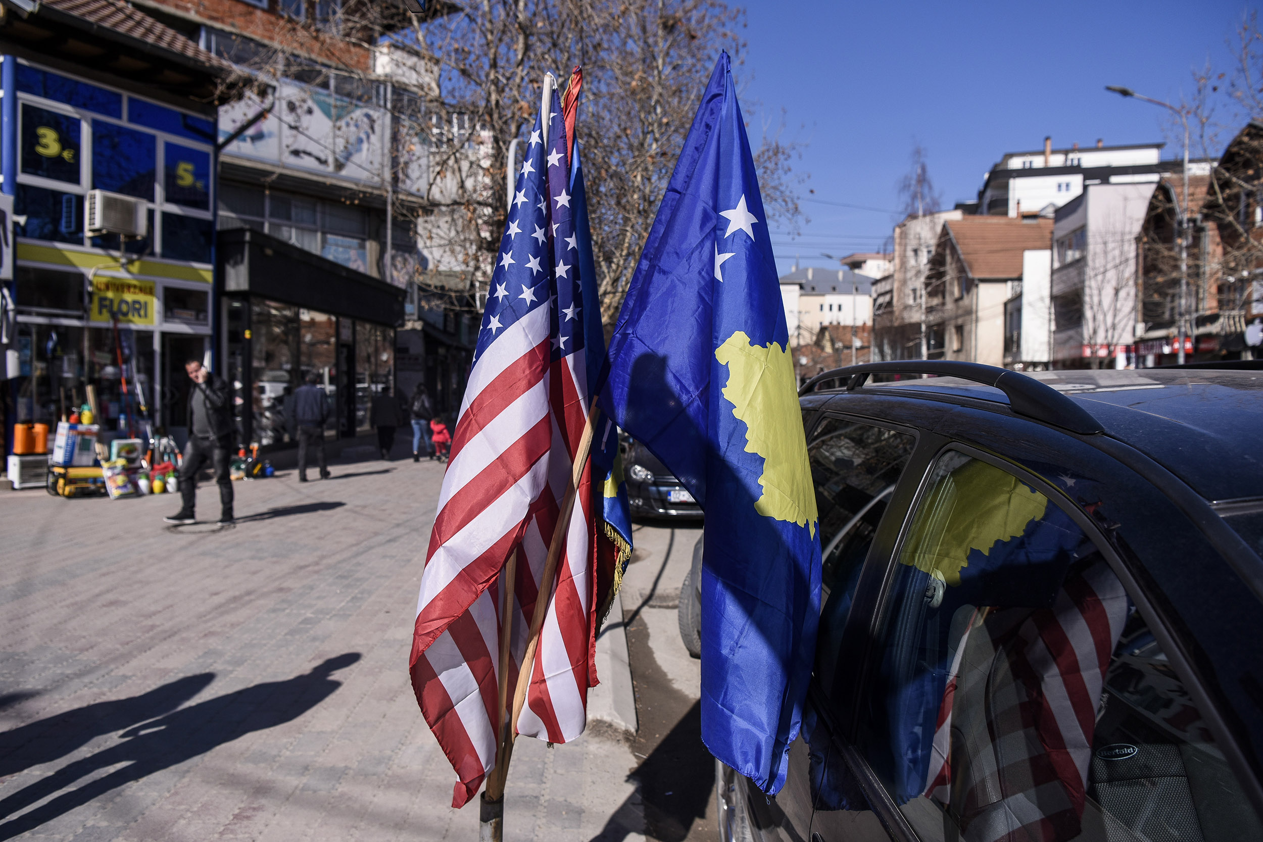 U.S. and Kosovo flags displayed for sale in the street in the town of Mitrovica on March 4, 2019.