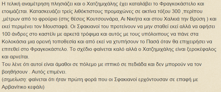 Siç shkruajnë historianët e pavarur, në kampet e Frangokastellos shqiptarët e të dyja palëve e njihnin njëri-tjetrin. Mustafa Pasha madje i dërgoi një letër Haxhi Dalanit duke e quajtur “Haxhi-Baba” dhe i kërkoi, për hir të origjinës së përbashkët, të tërhiqej për të mos derdhur gjak kot. Por nderi ushtarak i komandantit shqiptar nuk e lejonte tërheqjen.