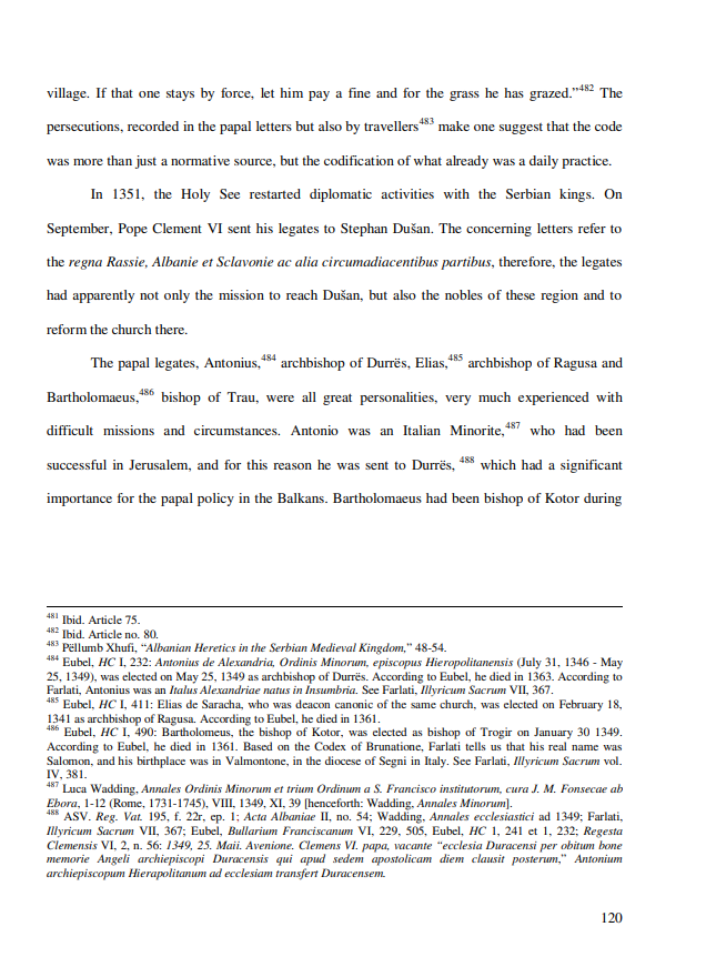• Regestum Clementis VI. (Vol. X). Vatikani: Roma. (Për letrën Super quibusdam të 29 Shtatorit 1351 dhe letërkëmbimet e viteve 1346–1354, që përmendin uzurpimin e Ecclesiae Latinorum në regnis Rassie, Albanie et Sclavonie).