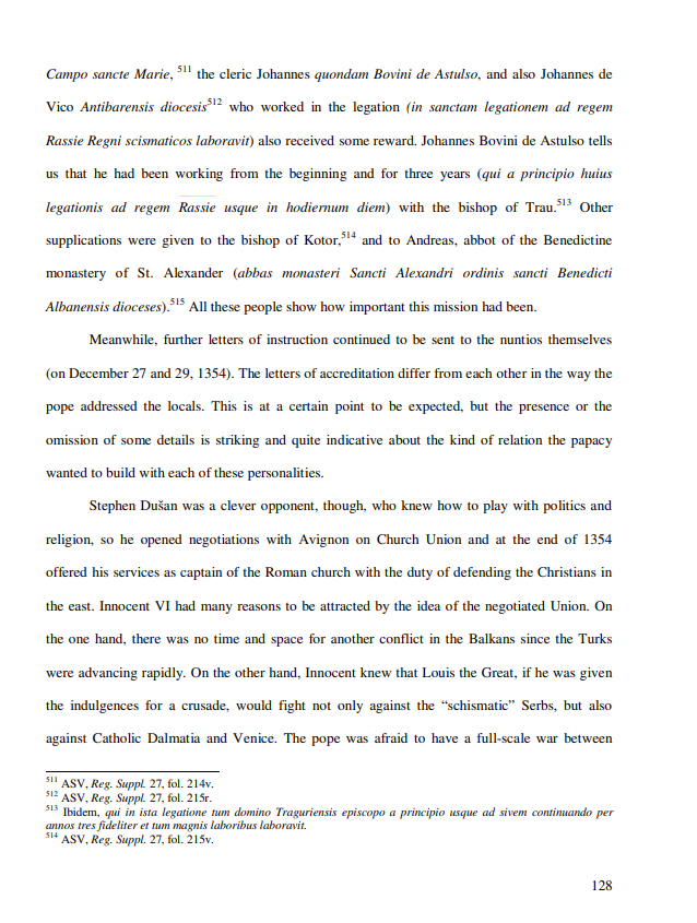 “Super quibusdam negotiis statum et iura Romanae Ecclesiae in regnis Rassie, Albanie et Sclavonie ac alia circumadiacentibus partibus respicientibus… quod non paucae Ecclesiae Latinorum ac alii loci ecclesiastici et bona mobilia et immobilia… per Dusanum, ipsum et alios occuparentur, et eadem bona ad ritus Graecorum transferrentur, et Latinis Clericis et aliis Christi fidelibus in ipsis locis libertas cultus negetur.”
