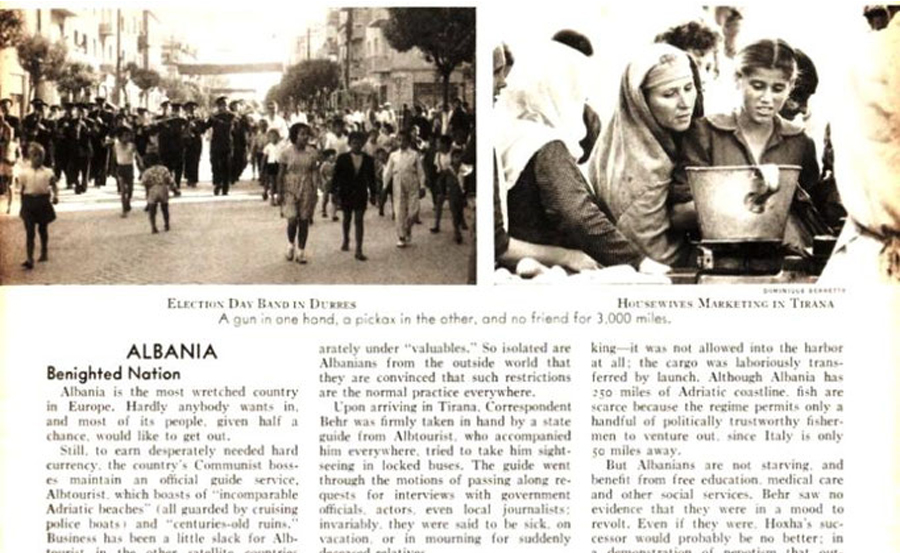 I ndarë nga miku i vetëm në botë, Kina e Kuqe, me 3,000 milje largësi, Shqipëria jeton në një izolim njëherësh sfidues dhe të trishtueshëm. Më shumë se 70% e 1,700,000 banorëve të saj nxjerrin bukën e gojës nga toka e kolektivizuar; shumica e fshatrave dhe qyteteve malore kanë mbetur pothuajse si në shekullin e kaluar. Plehrat rrjedhin nëpër një kanal të hapur në mes të rrugëve të ngushta; burra me hundë shqiponje pinë kafe turke në kafene të errëta, ndërsa gratë e tyre mbajnë mbi supe dru ose fuçi me ujë të rrallë. Përkrah varfërisë tradicionale shfaqen posterët komunistë që shpallin parullën e diktatorit Enver Hoxha : “Ndërto socializmin në njërën dorë me kazmë dhe në tjetrën me pushkë”.