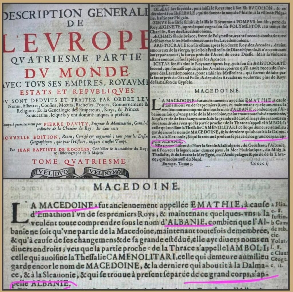 4. Davity, Pierre (Seigneur de Montmartin) & De Rocoles, Jean-Baptiste. (Botim i shek. XVII). Description générale de l’Europe, quatriesme partie du monde avec tous ses empires, royaumes, estats et républiques. Tome IV. (Referencë mbi përfshirjen e Maqedonisë nën emrin e Shqipërisë).