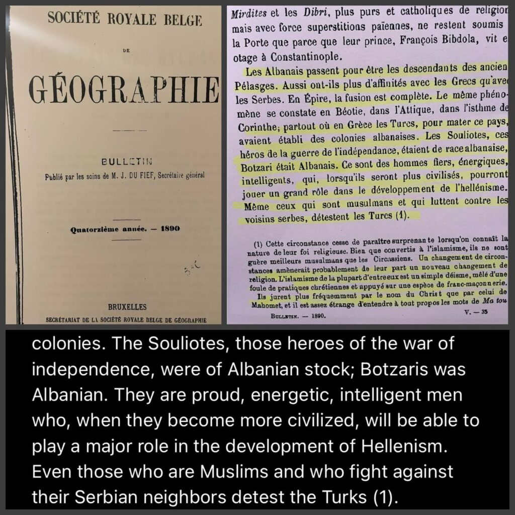 Identiteti shqiptar i këtyre trevave vërtetohet edhe nga Bulletin de la Société Royale Belge de Géographie (1890), i cili specifikon se edhe heroi i pavarësisë greke, Marko Boçari (Botsaris), ishte i racës shqiptare. Dokumenti thekson se “fusioni është i plotë” në Epir dhe se Suliotët ishin të gjakut shqiptar.