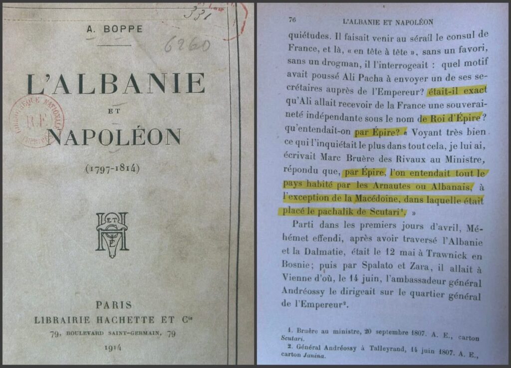 Në vitin 1807, diplomacia franceze lunate një lojë shahu me përmasa botërore. Dokumenti i A. Boppe (1914) zbulon bisedat “tête à tête” mes konsullit francez dhe Ali Pashë Tepelenës. Marc Bruère des Rivaux, një diplomat i mprehtë i kohës, i shkruante Ministrit të Jashtëm francez se me termin “Epir” kuptohej “i gjithë vendi i banuar nga Arnautët ose Shqiptarët”.