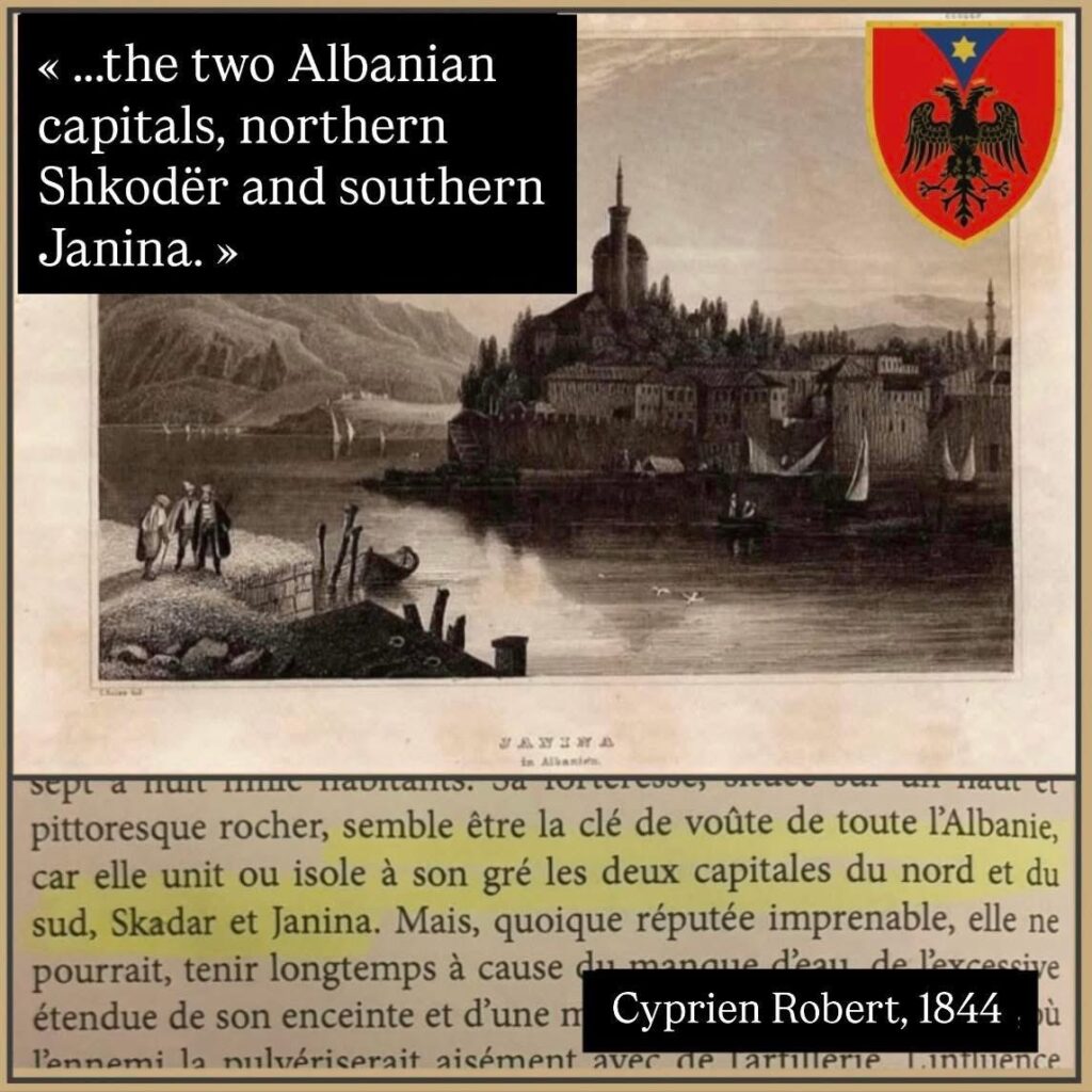 Në vitin 1844, Cyprien Robert, një studiues i njohur i sllavëve dhe i Ballkanit, e përshkruante Shqipërinë si një trup me dy koka: Shkodrën në Veri dhe Janinën në Jug. Për vëzhguesit europianë, Janina nuk ishte një qytet grek i “pushtuar” nga shqiptarët, por “çelësi i krejt Shqipërisë”.
