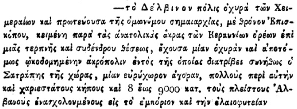 Autori bën një saktësim të rëndësishëm për Delvinakin, duke e quajtur vendbanim të shqiptarëve ortodoksë. Po ashtu, ai përfshin Suliotët dhe Pargjinotët brenda fiseve shqiptare, duke i cilësuar si më “të qytetëruarit” e këtij trungu.