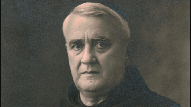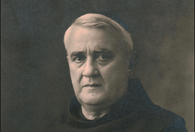 Më përshëndeti i buzëqeshur: më në fund, ishte At Fishta! U ngrit, duke çuar krahët e tij të fuqishëm, më zgjati dorën dhe më ftoi të ulesha; u ul edhe ai. Më pas, me një shqipe të rrjedhshme, më ftoi të pija duhan. E ndezi cigaren e tij duke e dredhur. At Fishta ishte atëherë 69 vjeç, por nuk tregonte as gjashtëdhjetë. Megjithëse tryeza fshihte një pjesë të trupit të tij, struktura e bustit, e kokës dhe e krahëve ravijëzonin një personazh të veshur mirë e madhështor. Shikim i gjallë, shprehës, nën ballin e gjerë e pa rrudha. Fytyra e pastër, e trëndafiltë; fjala e peshuar, gjesti i ngadaltë e i sigurtë, zbulonin një murg të regjur në studime dhe meditim. Është malësori ekspert në përshkrimin e burrave dhe luftërave. Mbante veshur një zhgun të ri, të errët, në të cilin, në vend të vrimës së një kopse, spikaste distinktivi i Akademisë së Italisë. Mbi tryezë kishte letra e libra, jo në një përsosuri rregulli, por as edhe çrregullt. Në të majtë i varej një kryq. Qela nuk ishte e madhe, megjithëse e rehatshme, e ndriçuar dhe e qetë. Dy dritare nga kopshti shquanin një fik të bukur, që shkëlqente në diell dhe ndër gjethet e pemëve frutore, disa harabela çukitnin fshehurazi, duke lëvizur herë – herë mbi kryet tanë. Nuk e dinin që ai fik u përkiste bijve të Shën Françeskut!… Mbi tryezë, poshtë syve, at Fishta kishte një dorëshkrim, në të cilin po bënte disa korrigjime.
