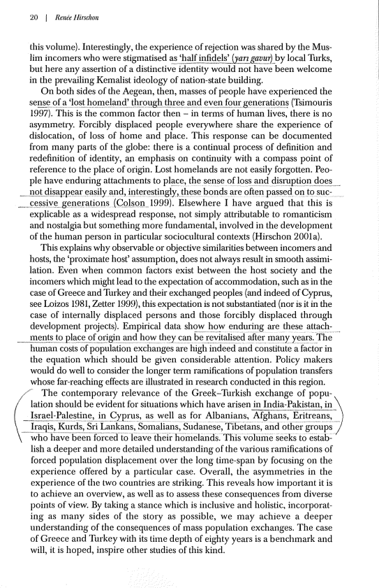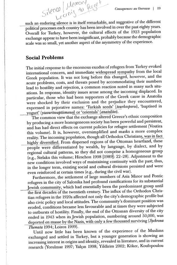 Tekstet shkencore, si ai i Hirschon, theksojnë se megjithëse Marrëveshja e Lozanës arriti ne dukje të prodhonte një Greqi më homogjene nga pikpamja fetare, kjo u arrit në kurriz të dhimbjes njerëzore dhe shpërfilljes së diferencave kulturore, gjuhësore dhe dialektore që ekzistonin brenda komunitetit.