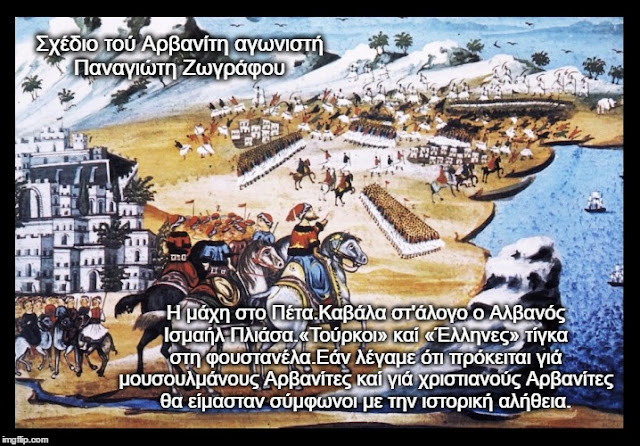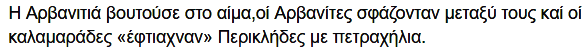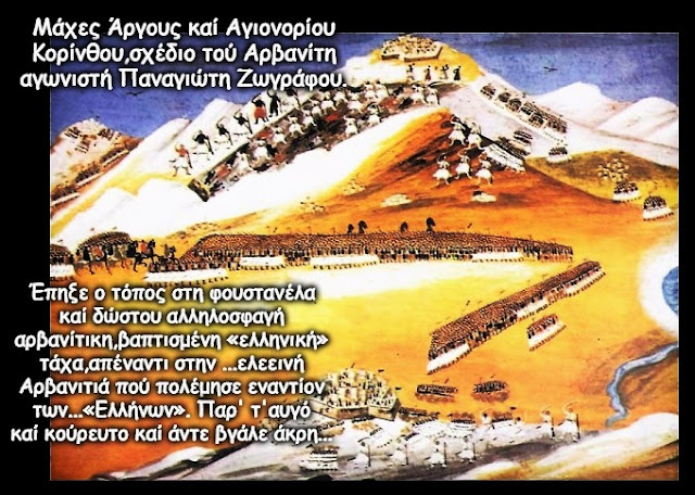 Arvanitët e 1821-shit ishin bartësit e këtij gjaku. Mirëpo, për të legjitimuar projektin e ri shtetëror, kjo rrënjë “pellasge” duhej të fshihej. U desh një punë e madhe propagandistike nga “kalamarasit”-kalemxhinjtë për t’u mbushur mendjen pasardhësve të ilirëve se ata ishin “pasardhës të drejtpërdrejtë të Perikliut”, duke mohuar kështu vëllazërinë etnike me shqiptarët e tjerë.
