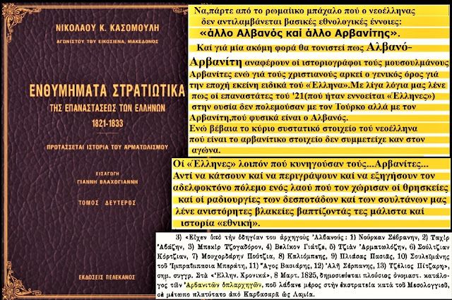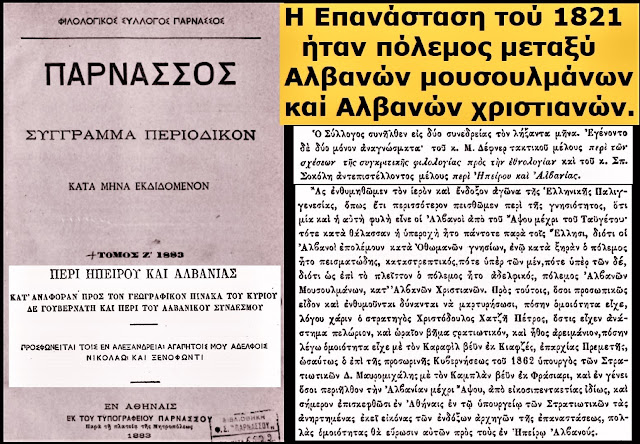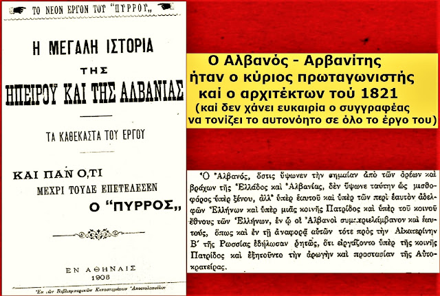 Në dokumentin e titulluar “Historia e Madhe e Epirit dhe e Shqipërisë” (1908), autori thekson një të vërtetë që shpesh censurohet: Shqiptari-Arvanit ishte protagonisti kryesor dhe arkitekti i vitit 1821 (Viti i revolucionit “grek”). Ata nuk luftuan si mercenarë për një komb të huaj, por për një “Patridë të përbashkët” (Vatër të përbashkët). Por, siç vërehet në dëshmitë e mëvonshme, pas fitores, “arkitektët” u dëbuan nga ndërtesa që projektuan vetë. Flamuri që ata ngritën në malet e Epirit dhe të Moresë u mor nga elita e instaluar, e cila filloi procesin e “pastrimit” të termave, duke i shndërruar heronjtë arvanitas në “Hellenë të pastër”.