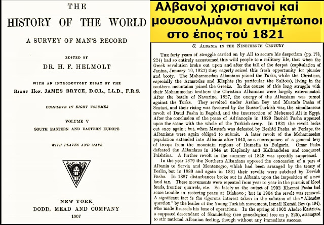 - Historiani H.F. Helmolt, në “Historinë e Botës”, thekson se si suliotët dhe armatolët (shumica dërrmuese shqipfolës) u bashkuan me kauzën greke, ndërsa vëllezërit e tyre muslimanë qëndruan me Turqinë.