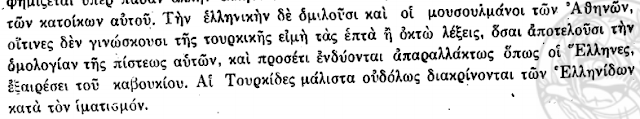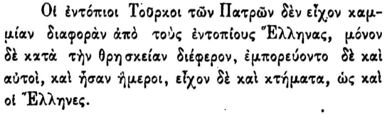 Një dëshmi tronditëse vjen nga dokumentet që përshkruajnë muslimanët e Athinës (fig. 16). Ata quheshin “Turq”, por nuk dinin as 7-8 fjalë turqisht. Flisnin greqisht ose “arvanitika” shqip, visheshin identik si “Grekët” dhe gratë e tyre nuk dalloheshin nga greket përveç një detaji të vogël në kapelë. Kjo tregon se “Turku” i vitit 1821 në Greqi ishte thjesht fqinji arvanitas që nuk pranoi të ndërronte fenë. Kur këta “Turq” u masakruan ose u dëbuan, Greqia në fakt vrau një pjesë të vetvetes.
