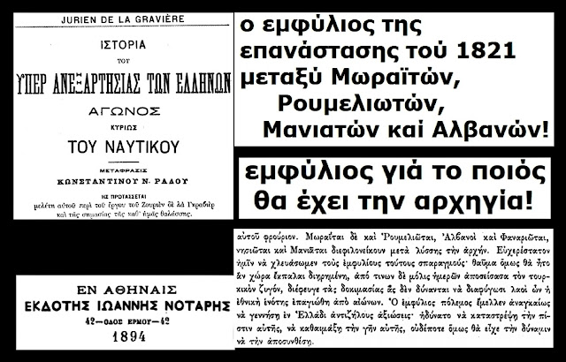 Përplasja e vitit 1821 ishte, në thelb, një luftë civile brenda të njëjtit lloj (adelphoktono), e nxitur nga elita fanariote dhe interesat e fuqive të mëdha, të cilët kishin nevojë për një “Greqi antike” si mburojë gjeopolitike, edhe pse popullsia në terren ishte kryesisht arbërore.