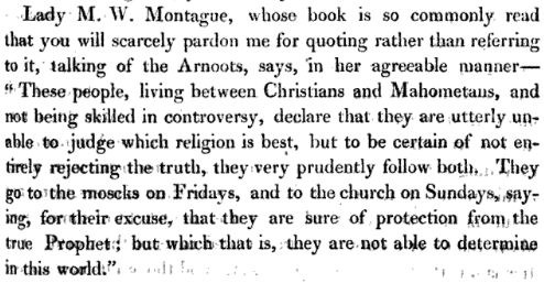 Një dokument kyç nga dëshmitë e Lady Mary Wortley Montagu zbulon një anë të panjohur të Arvanitëve (të cilët ajo i quan “Arnouts”). Ajo përshkruan një popull që jetonte në një lloj “neutraliteti fetar” për të mbijetuar: