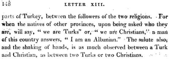 Përpara se propaganda e “kalamarasëve” të helenizonte masat, dëshmitë e udhëtarëve si J.C. Hobhouse (1813) dhe dëshmitë në dokumentet e kohës (si në Letter XIII) na tregojnë një realitet tjetër. Ndërsa në provincat e tjera të Perandorisë Osmane pyetja “Kush je?” merrte përgjigje fetare (“jam turk” ose “jam i krishterë”), në trojet arvanitase udhëtari habitej nga një përgjigje që sot tingëllon si akt rebelimi: “I am an Albanian” (“Unë jam shqiptar”). Ky dokument dëshmon se përpara 1821-shit, etnia qëndronte mbi fenë. Shkundja e duarve dhe respekti reciprok mes një “turku” (shqiptar musliman) dhe një “krishteri” (shqiptar i krishterë) ishte normë sociale, jo përjashtim.