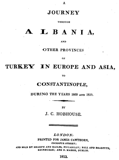 - Hobhouse, J. C. (1813). A Journey through Albania, and other provinces of Turkey in Europe and Asia, to Constantinople, during the years 1809 and 1810. London: James Cawthorn. (Referuar “Letrës XIII” mbi identitetin etnik).