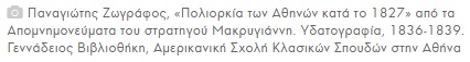 - Kasomoulis, N. (1832-1841). Ενθυμήματα Στρατιωτικά της Επαναστάσεως των Ελλήνων (Kujtime Ushtarake të Revolucionit të Helenëve). Dorëshkrime mbi përbërjen etnike të trupave në rrethimin e Akropolit.