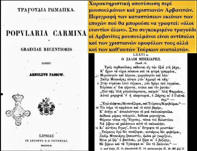 Në përmbledhjen “Popularia Carmina” (1860) të Arnoldus Passow, gjejmë përshkrimin e tmerrshëm të gjendjes “të gjithë kundër të gjithëve”. Këngët si ajo e Salim Bekiarit tregojnë se Arvanitët muslimanë ishin në luftë jo vetëm me kinsmenët e tyre të krishterë, por edhe me “Turqit anadollakë”. Kjo vërteton se lufta nuk ishte etnike mes grekëve dhe turqve, por një luftë civile ballkanike. Dokumentet e vitit 1894 (Jurien de la Graviere) e konfirmojnë këtë: revolucioni ishte një “Luftë Civile” mes Moreaotëve, Rumeliotëve, Maniotëve (të tre në masë të gjerë arbërorë) me shqiptarët në krye.