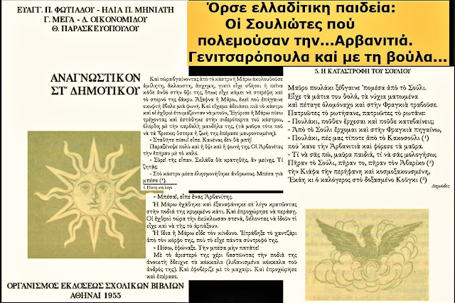 Një nga pikat më revoltuese të ngritura është edukimi shtetëror grek. Tekstet e vitit 1955 (si “Anagnostikon” i klasës së 6-të) i mësonin fëmijët arvanitas se “Suliotët luftuan Arvanitinë”. Ky është një kulm i tjetërsimit: t’i mësosh pasardhësit të Arvanitit se paraardhësi i tij ishte “armiku” i vetvetes.